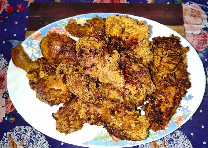 - After that take a bowl. Add Corn Flour, Maida, Chilli powder, Salt to taste then take the marinated chicken and dip into the mix and give High Flame Fry to get crispy KFC type chicken..